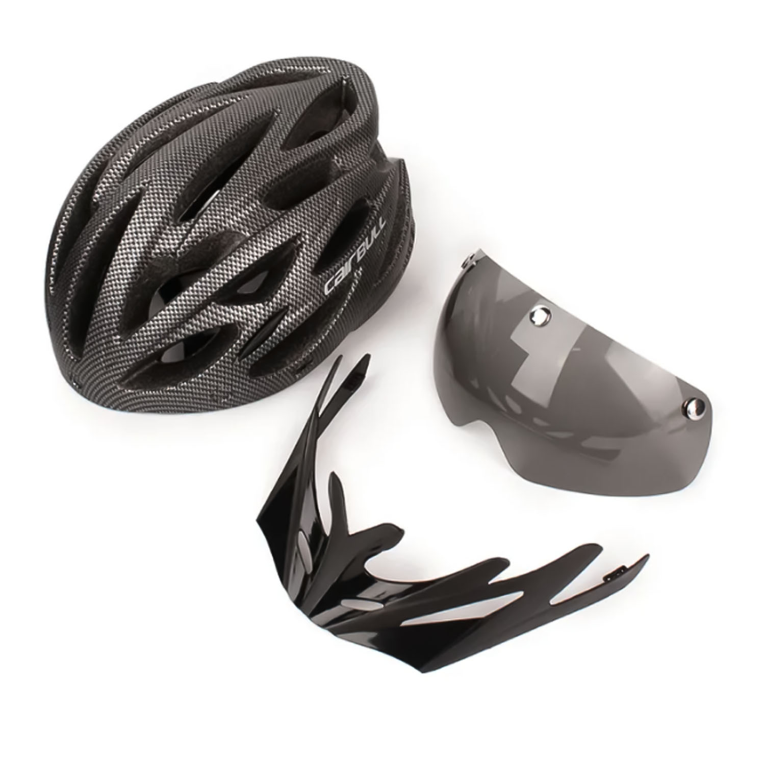 Велошлем со съемным визором Cairbull предназначен для защиты головы при катании на велосипеде, лыжероллерах или моноколесе. Размер шлема для велосипеда регулируется от 54 до 61 сантиметра. Вентиляционные отверстия обеспечивают удобство при катании в жаркую погоду. Съемный визор выполнен из небьющегося поликарбоната и крепится к шлему на магнитах. Экран обеспечивает отличный обзор и гарантирует безопасность глаз от солнечных лучей, пыли и насекомых. Также в комплекте козырек из пластика, который крепится при помощи двух защелок. Сзади фонарь красного цвета с тремя режимами работы. Система ремней Y-strap с мягкой подкладкой для подбородка. Шлем для велосипеда имеет съемную и моющуюся подкладку. Корпус изготовлен из ударопрочного поликарбоната и вспененного пенополистирола. Шлем подойдет любителям как горного, так и шоссейного велосипеда.