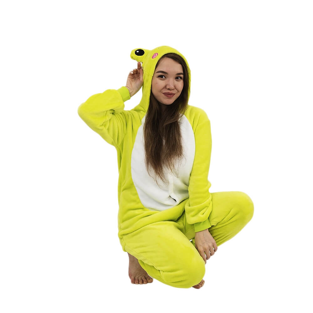Кигуруми сочного желто-зеленого цвета поднимет настроение и создаст атмосферу веселья и праздника. Его можно надевать на вечеринку или костюмированный праздник, использовать как домашнюю одежду. Просторный крой не сковывает движения, дарит свободу. В нем удобно танцевать, прыгать, лежать на диване в любых позах.