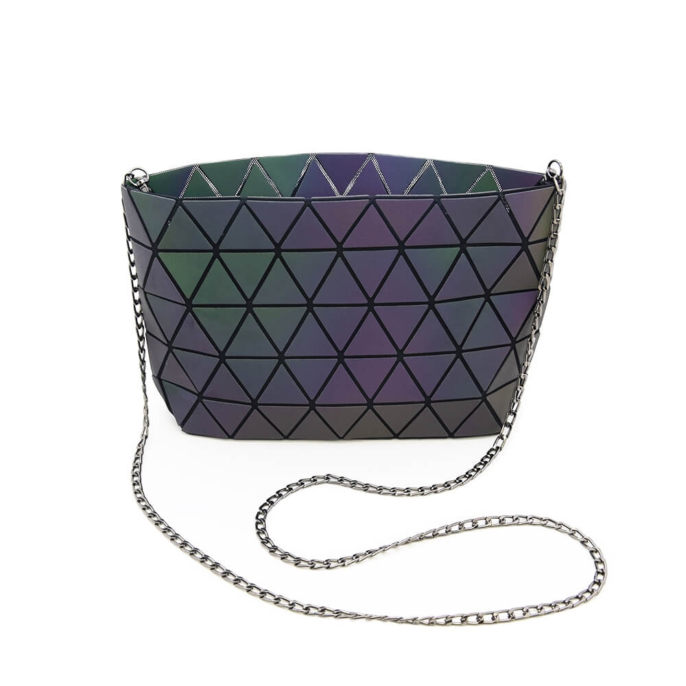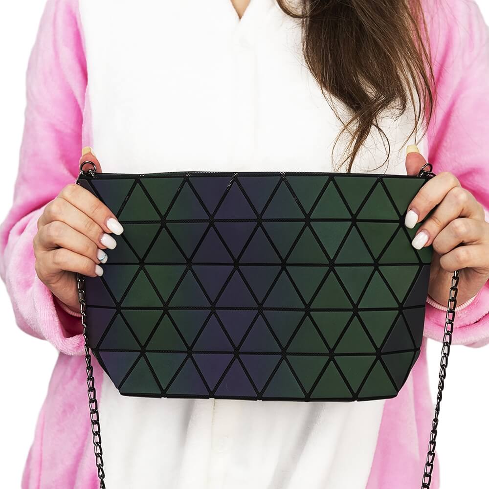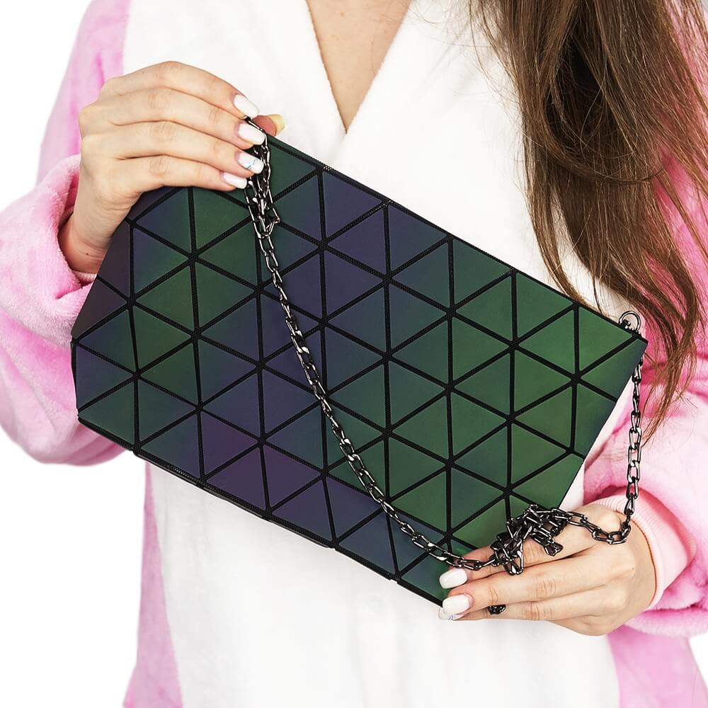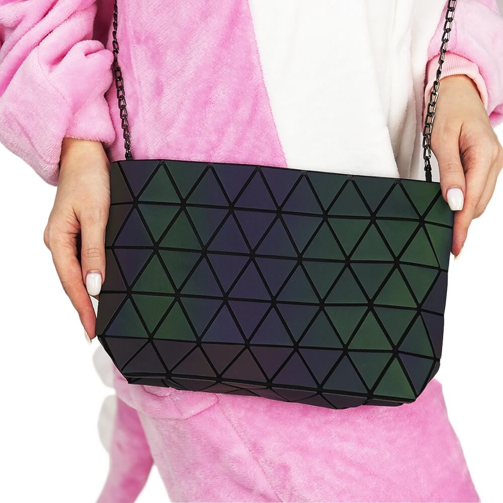 Универсальная женская сумка на каждый день для самого необходимого. В сумке несколько внутренних карманов, застежка «молния» и регулируемая по длине цепочка для ношения на плече. Сумка выполнена из прочного нейлона с полиуретановым покрытием типа «Хамелеон». Покрытие отражает свет различного оттенка под разным углом, создавая непередаваемый эффект переливающихся цветовых гамм. Поверхность материала расчерчена треугольным узором.