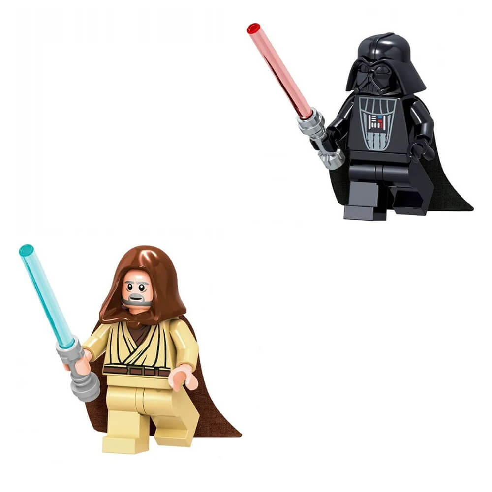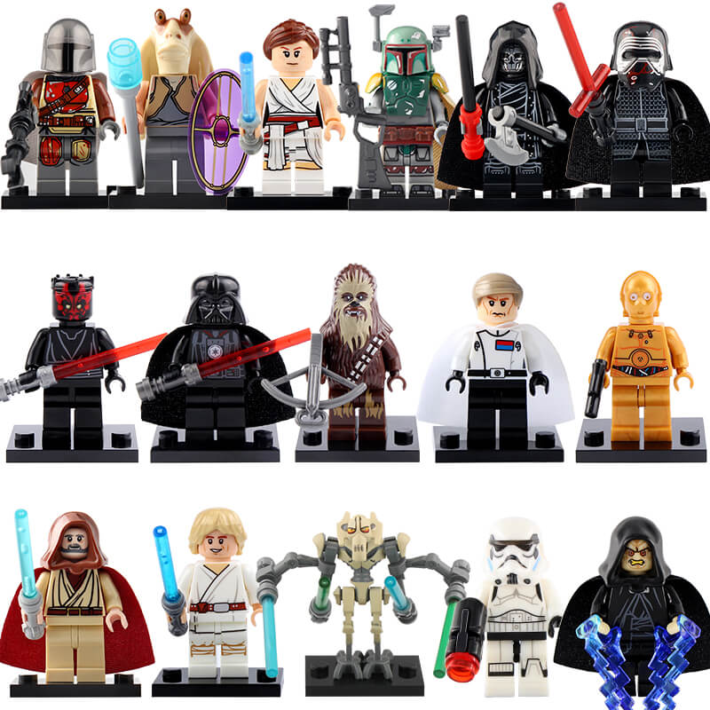 Набор фигурок Звездные войны, 16 шт совместимый с лего – это пластиковые изделия в виде любимых героев известного фильма. Красочные игрушки для детей совместимы с конструкторами lego и легко закрепляются либо открепляются от деталей. Коллекционные детские мини фигурки выполнены в цветах персонажей и имеют характерные атрибуты – мечи, щиты и другое оружие, которое моно вытащить из рук. Набор фигурок лего включает в себя основных персонажей – джедай Оби-Ван Кеноби, воин Штурмовик, путешественник Чуи, протокольный дроид С-3РО, рыцарь на темной стороне Дарт Вейдер, Рей Скайуокер, гункан Джа Джа Бинкс, Люк Скайуокер, охотник за головами Боба Фетт, Мандалорец, Генерал Гривус, Император Палпатин, темный владыка Дарт Мол, Орсон Кренник, Кайло Рен с плащом, Кайло Рен. Все игрушки могут поворачивать руками и ногами.