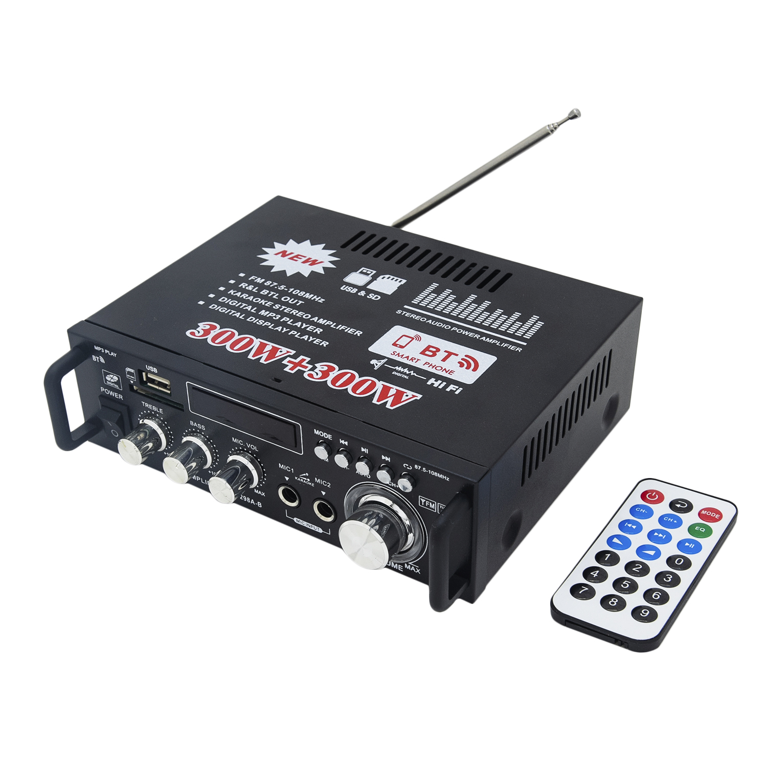 "Аудио Bluetooth усилитель TeLi 2-канальный 300 Вт + 300 Вт для колонок и для наушников изготовлен из железа. Усилитель мощности звука подключается через USB и CD карту, поэтому подойдет для ноутбука, для компьютера, стерео системы. Для беспроводного подключения имеется плата bluetooth. Цифровой двухканальный усилитель для дома с максимальной мощностью 300 Вт и номинальной мощностью 80 Вт обеспечивает качественное звучание на высоких и низких частотах на любой громкости. Получает питание через адаптер на 12 Вольт или от бытовой сети 220 Вольт. Аппарат управляется кнопками и поворотными регуляторами на лицевой панели. Усилитель домашний на ПК оснащен FM радио. "
