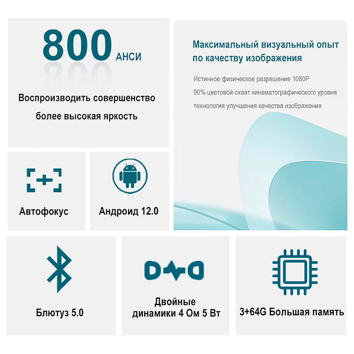 Проектор оснащен процессором Huawei HiSilicon 560 и встроенной операционной системой Android 12.0, а также имеет память объемом 3+64 Гб, что позволяет наслаждаться множеством приложений и мультимедийным контентом прямо на большом экране.