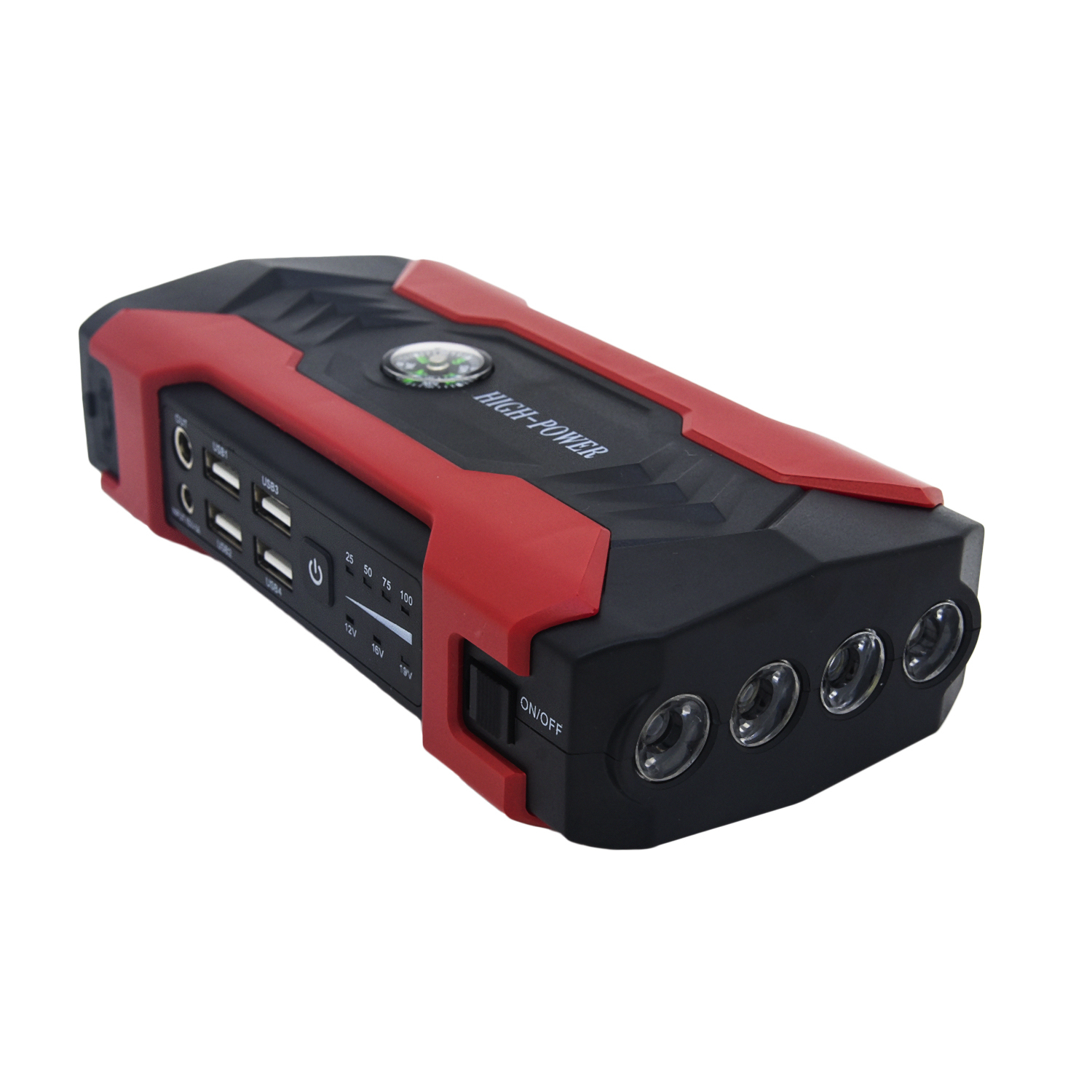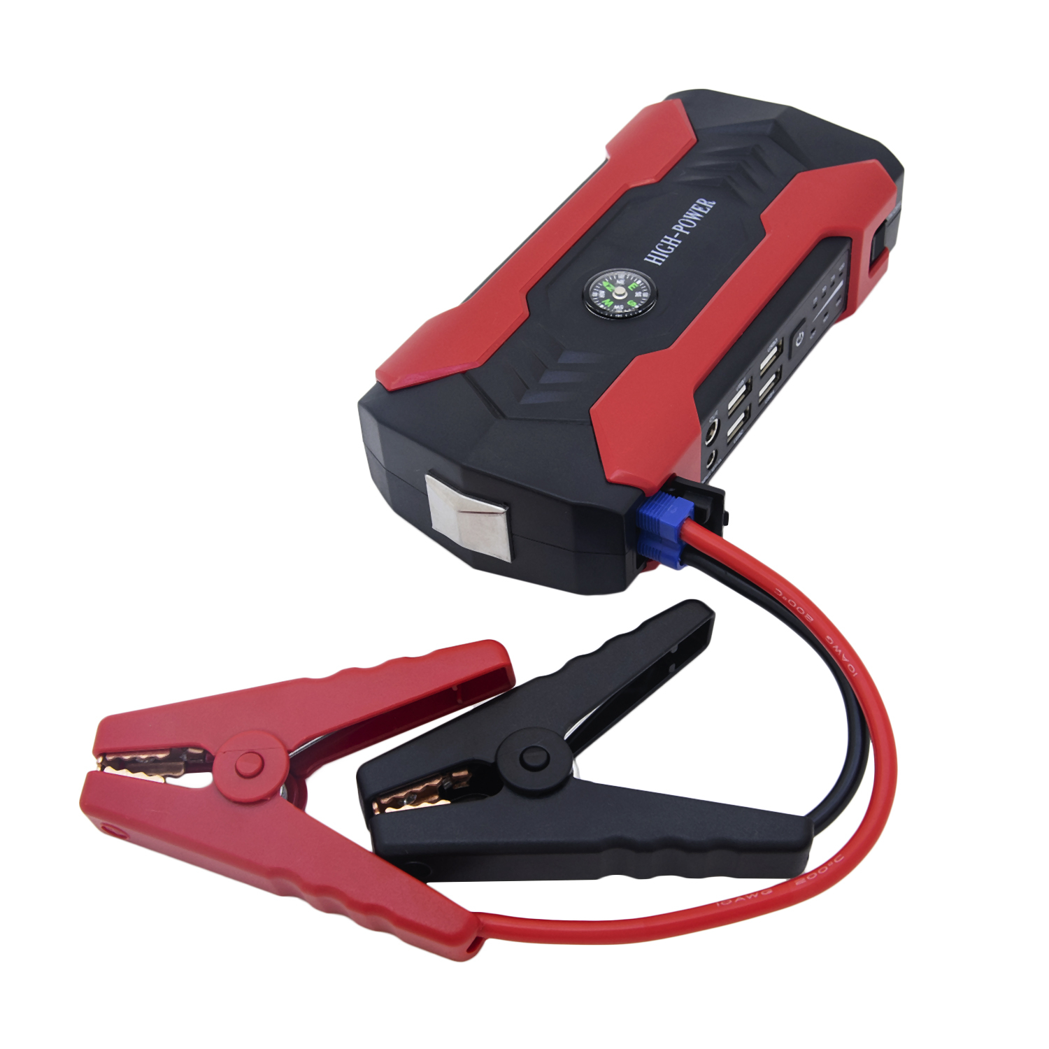 Пусковое зарядное устройство High Power Compas 20000 mAh может использоваться для запуска двигателя автомобиля или мотоцикла при разряженном аккумуляторе, как зарядка для смартфона/ноутбука. С помощью пускового устройство для двигателей автомобиля можно запустить транспортное средство даже в сильный мороз. Пуско зарядное устройство имеет мощный аккумулятор, у которого ёмкость 20000 мАч, при этом его вес не превышает 800 г. На боковой части расположено 4 разъема для зарядки устройств через USB порт. Пусковое устройство с функцией POWERBANK имеет светодиодный встроенный фонарик с хорошей яркостью. В наборе идут пусковое устройство, сетевой адаптер для питания от розетки 220В, универсальный переходник USB с тремя разъемами и кейс для хранения. Запуск автомобиля от пускового устройства производится по инструкции, которая также идет в комплекте.