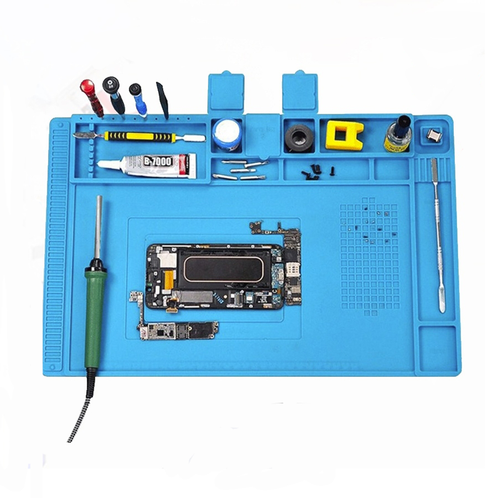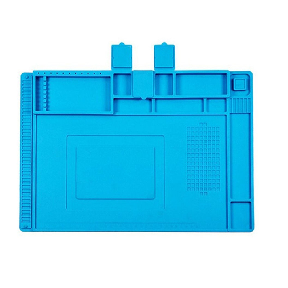 Силиконовый коврик для пайки TERS M9 термостойкий с магнитными ячейками для инструментов устойчив к высоким температурам, коррозии, статическому электричеству и деформации. Термостойкий коврик также можно использовать для работы с клеевыми составами. Большой антистатический коврик оснащен множеством отсеков, в который можно положить материалы и инструменты для пайки и ремонта, а также платы. Есть встроенная линейка 36 см для удобства измерения. При помощи магнитных крепежей можно зафиксировать металлические детали. Огнеупорный коврик надежно лежит на рабочей поверхности и не скользит. Монтажный коврик выполнен из экологически чистого силикона, который выдерживает нагрев до 500 градусов.