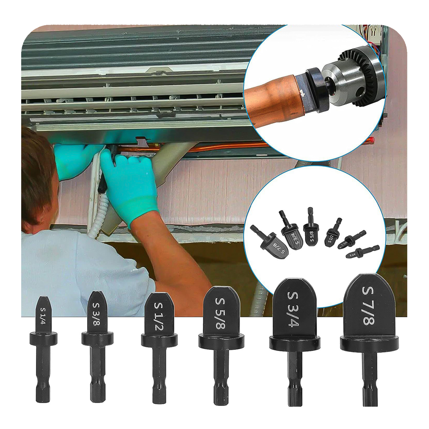 - Размер расширителя:прибл. 7/8 (22,2 мм/0,87 дюйма), 3/4 (19 мм/0,74 дюйма), 5/8 (15,9 мм/0,62 дюйма), 1/2 (12,7 мм/0,5 дюйма), 3/8 (9,5 мм/ 0,37 дюйма), 1/4 (6,3 мм/0,24 дюйма))