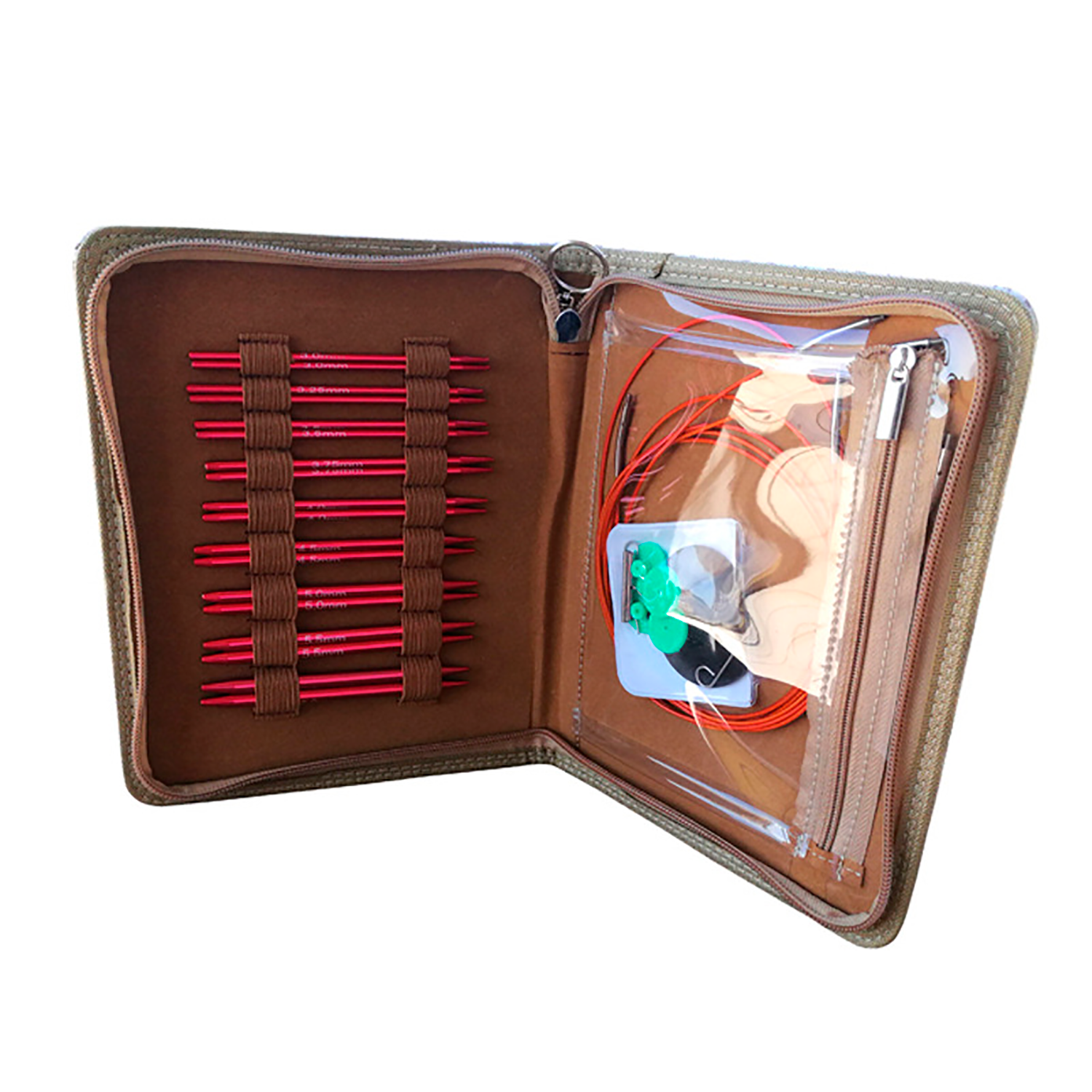 В набор входят круговые укороченные съемные спицы — 10 см которые легко соединяются без зазора через тросик с помощью соединительного ключа. В стильном органайзере помещаются вязальные спицы диаметра от 3 мм до 6 мм и дополнительные аксессуары облегчающие процесс вязания — Счётчик рядов который упрощает процесс вязания по готовой схеме, размерная линейка для диаметра спиц и трикотажные иглы пластиковые. Гладкое и надежное соединение лески с отполированной поверхностью кубических спиц позволяет получить больше удовольствия и расслабления в процессе вязания. В комплекте вязального набора 4 тросика для спиц — 40 см; 60 см; 80 см; 100 см, которые при необходимости можно объединить с помощью соединительного удлинителя и получить длину до 135 см.